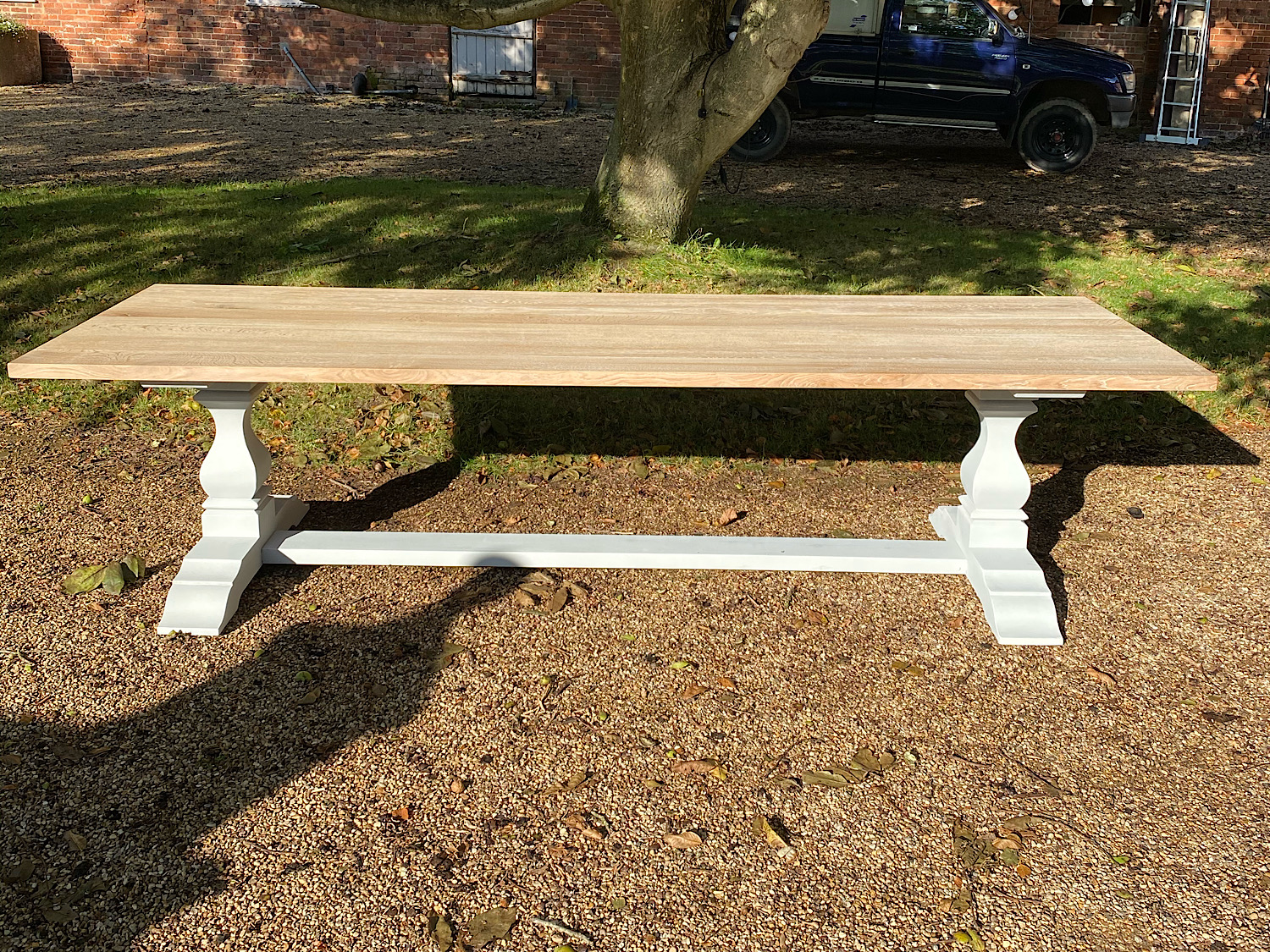 The solid oak top supported by hand carved pedestal bases with light distressed paint effect.