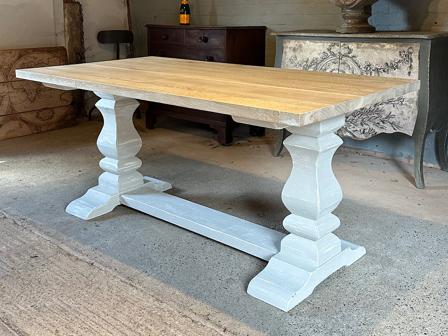 We craft the solid Oak table top which is supported by our hand carved Spanish style pedestal base with light distressed paint effect. There are various colour options for the base so feel free to be creative.