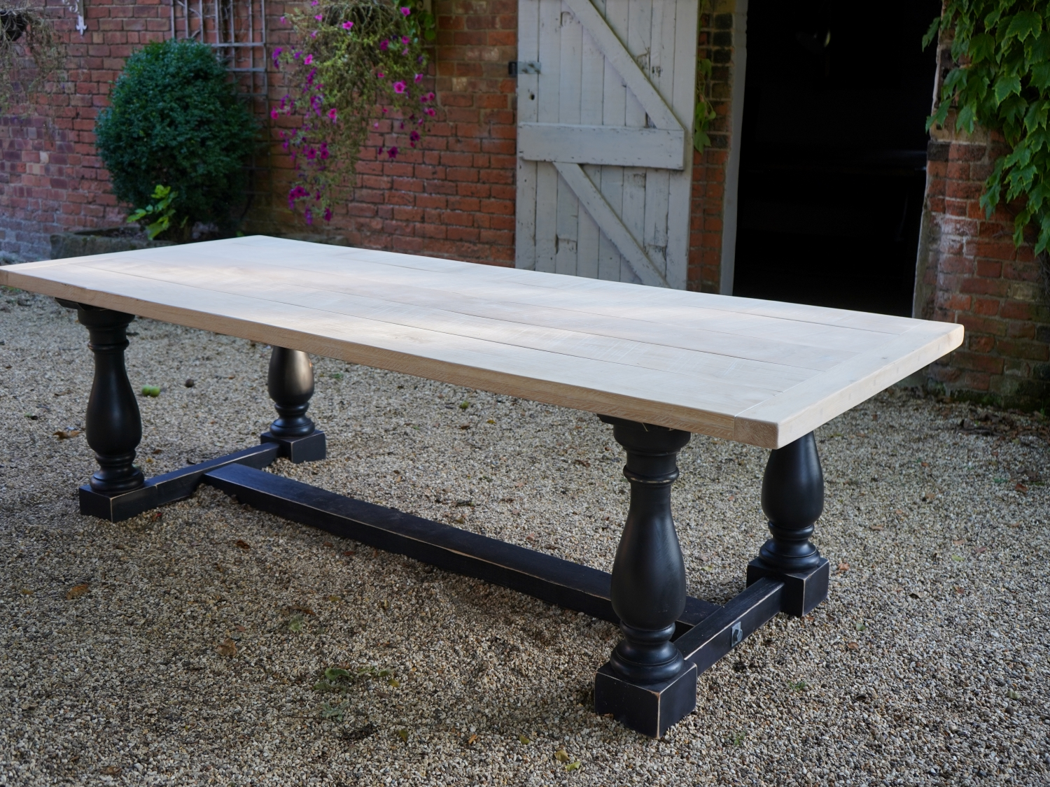 This traditional hand made dining table featuring an balustade leg base brings a wholesome rustic feel to any large dining space or kitchen.